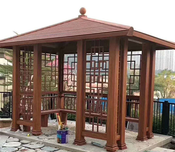大戶外涼亭系列產品是采用高強度鋁合金為原材料,經酸洗鉻化,電泳或靜電噴涂,木紋轉印處理后,精密定制設計,保障安裝。它具有防水防潮,不膨脹不變形,防腐蝕,具有逼真的木質感。成為別墅住宅及市政園林等建筑美麗的風景。