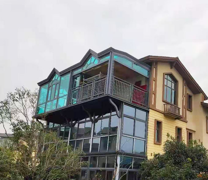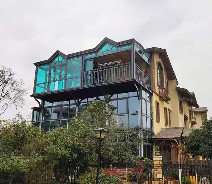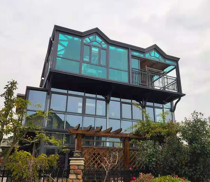 大戶外陽光房采用高強度鋁合金為原材料,經酸洗鉻化、氧化電泳或靜電噴涂,木紋轉印處理后,經過精密設計造型,配合鋼化玻璃封閉,別具一格。隔熱保溫,防止紫外線,美觀大方,可打造休閑或辦公空間,簡潔、上乘、實用,為建筑提升整體檔次。